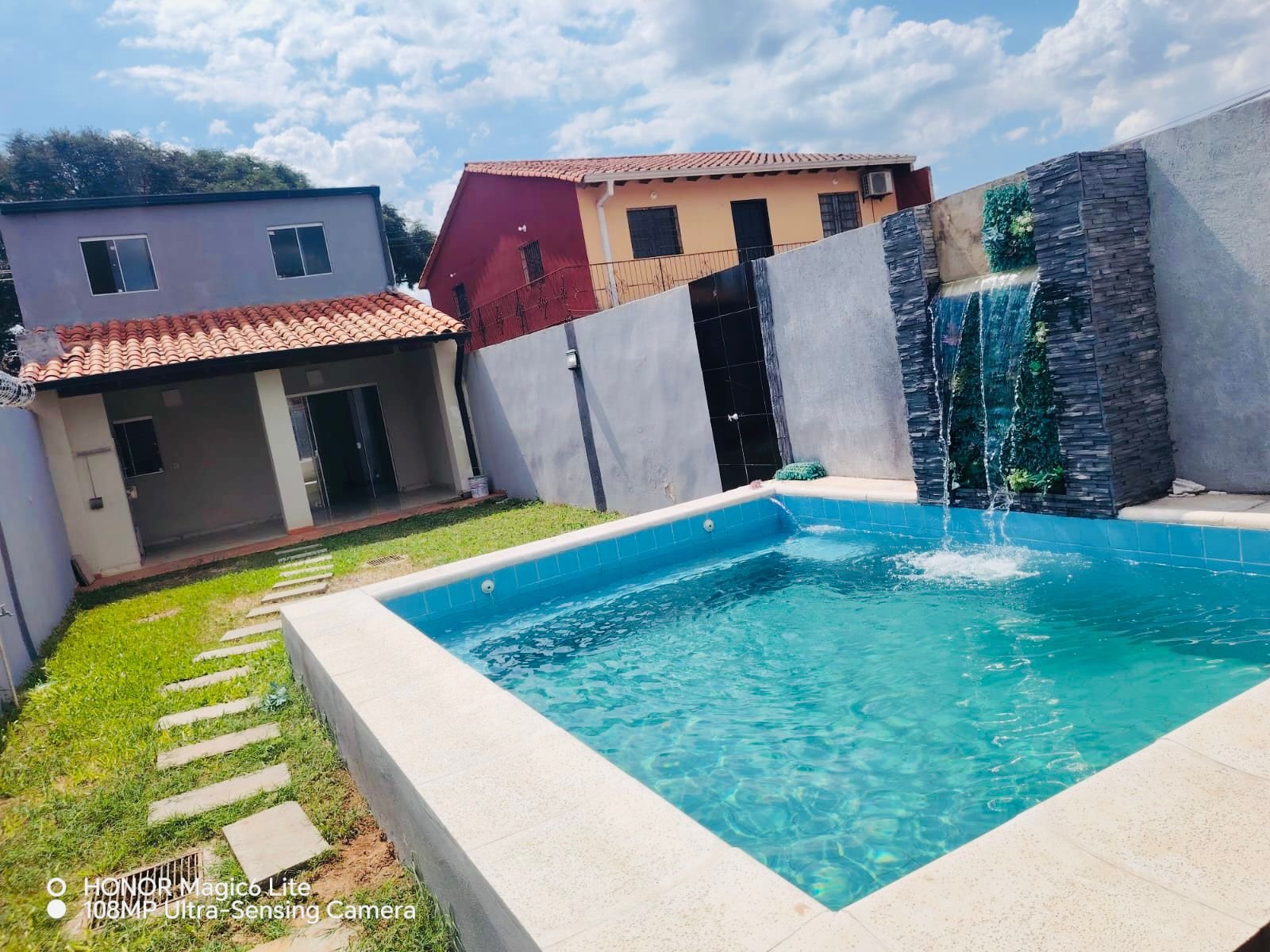 - 1 Patio con piscina con una hermosa cascada.